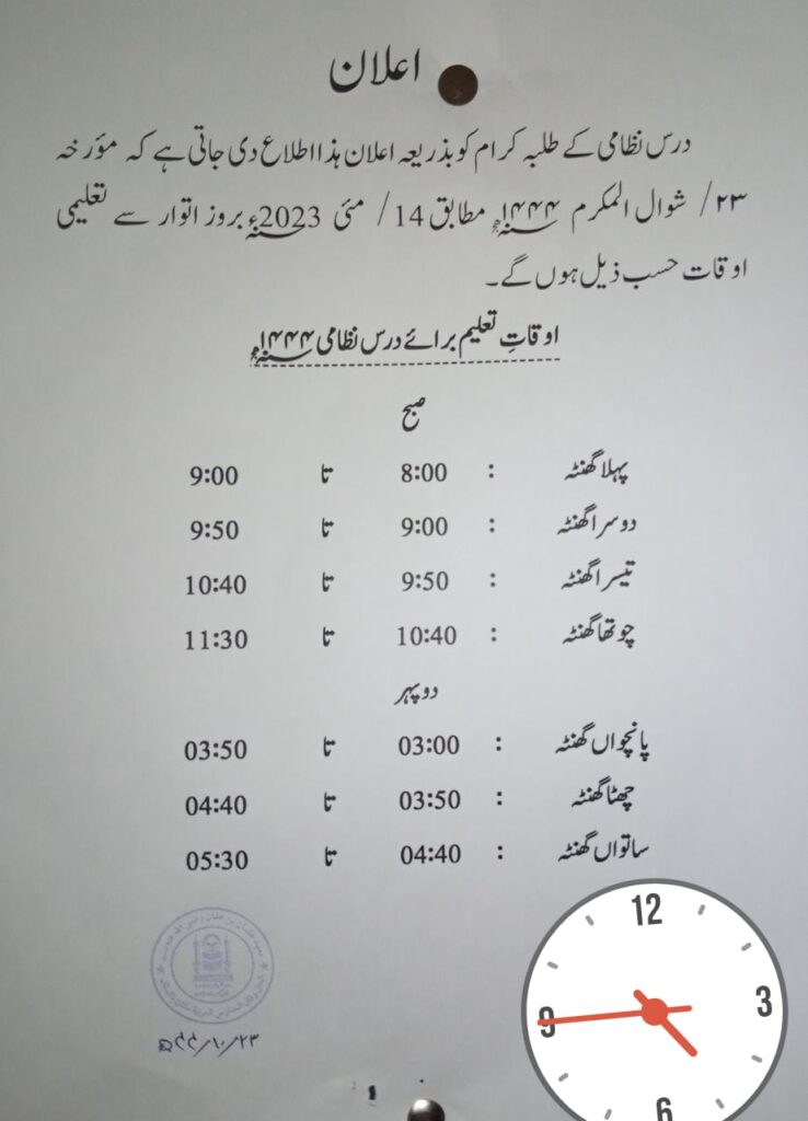لہذا تعلیمی اوقات درجِ ذیل ہے: