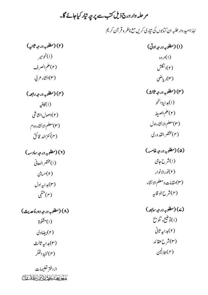 مختلف درجات کے جائزہ کے لیے امتحانی کتب کا نقشہ تیاری كےلیے مستقلاً آویزاں کردیاگیا ہے۔اس کو نوٹ کرلیجیے۔